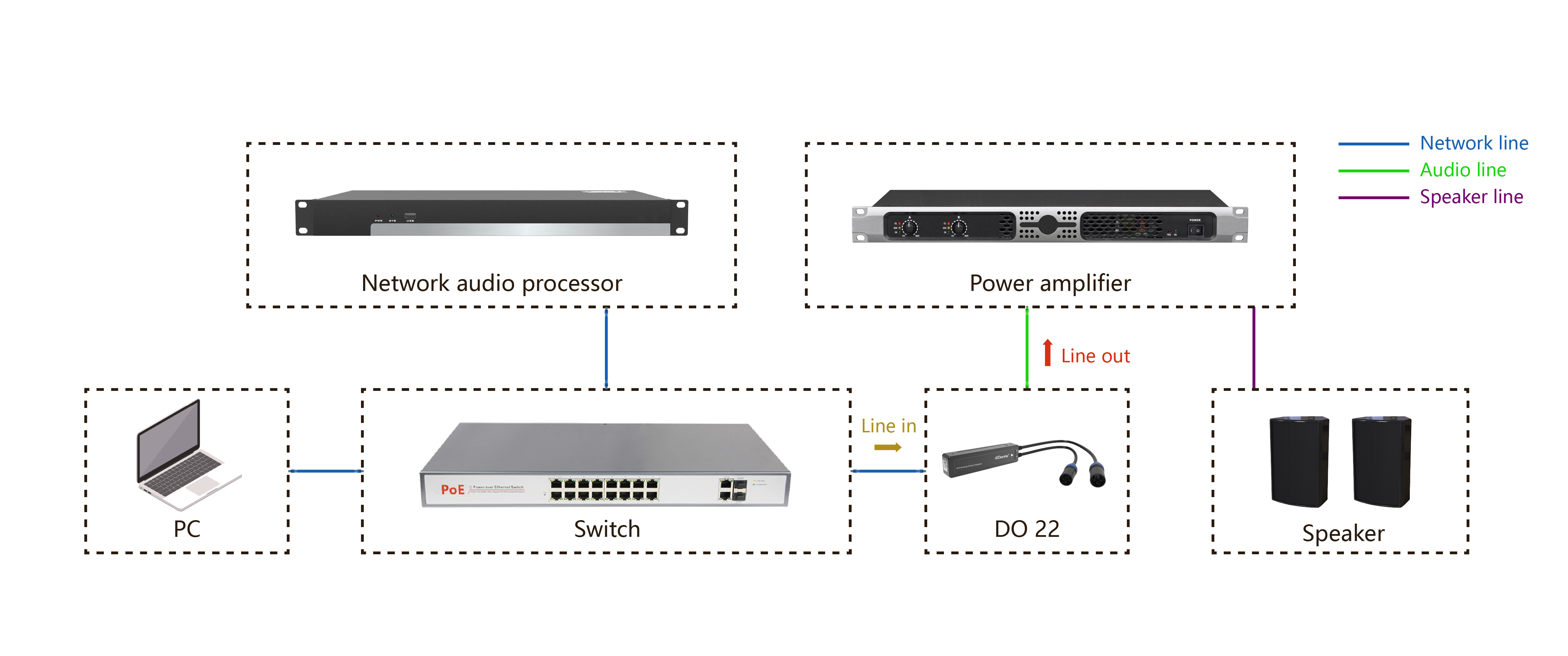 4. Konwertuj sygnały audio sieci Dante na analogowe sygnały audio dla wyjściowych.