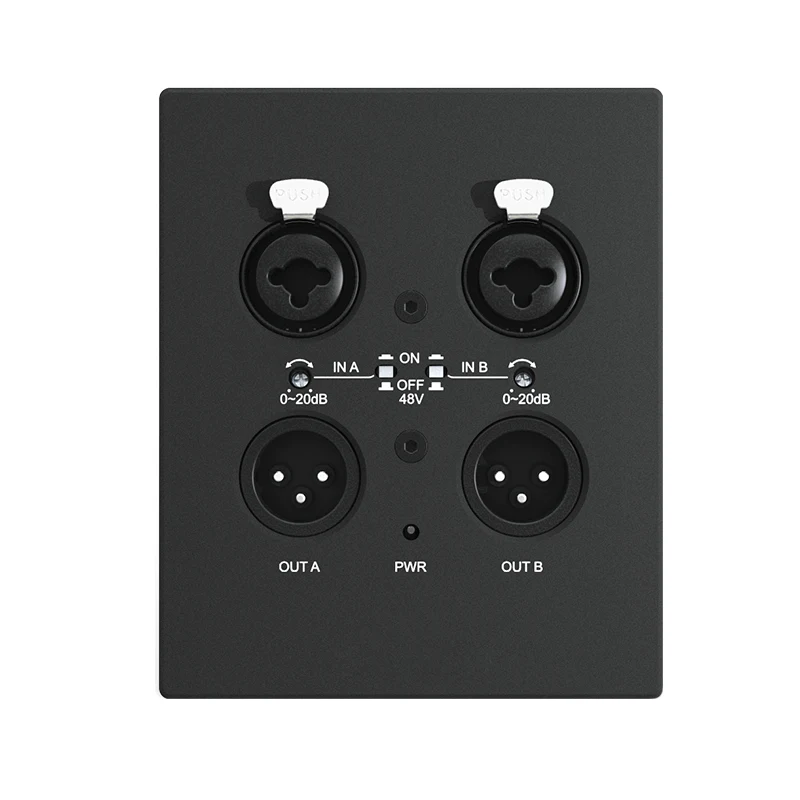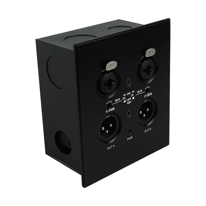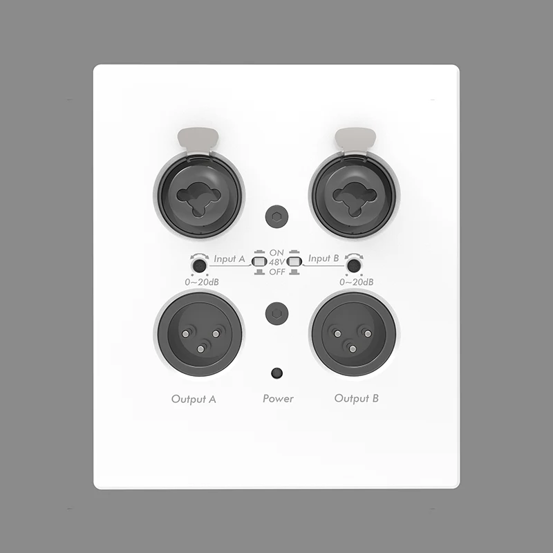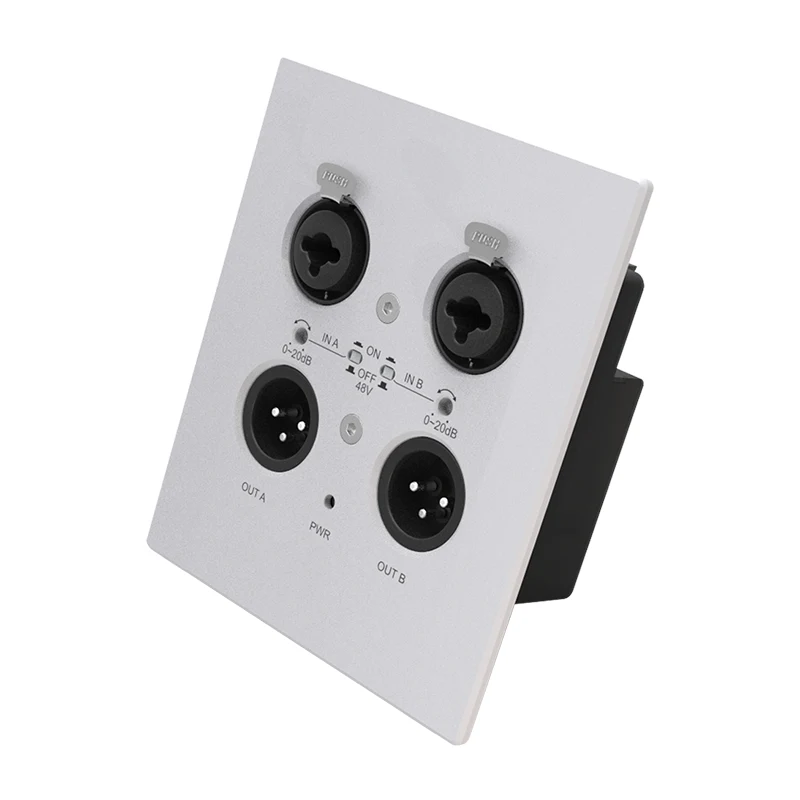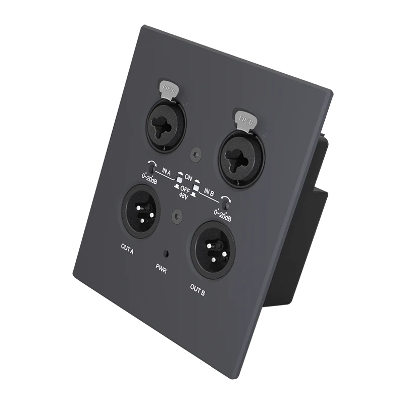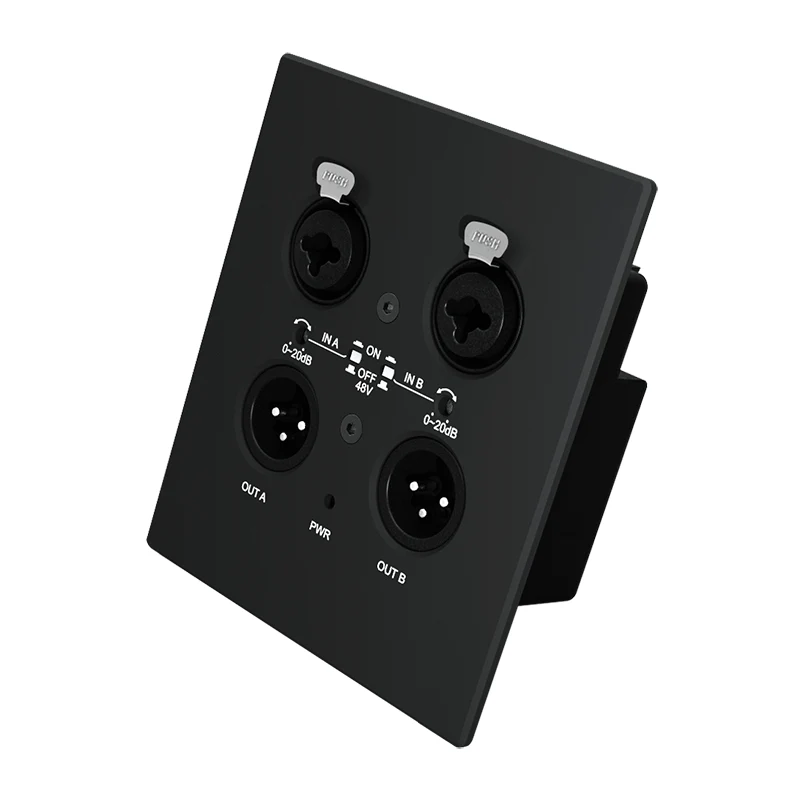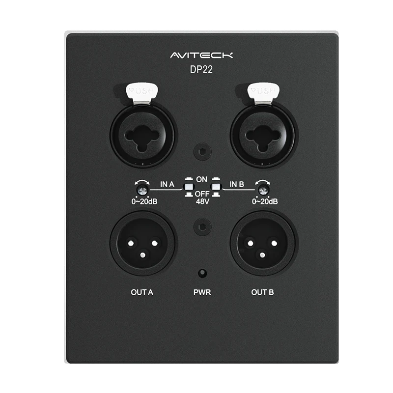 FHBAVTEC® DANTE 2 CH Płyta ścienna Interfejs audio (DP22) ma wbudowany moduł DANTE do analogu do cyfrowego przeniesienia sygnału DANTE i podwójny przełącznik zasilania fantomowego wejściowego. Kolejną świetną cechą jest to, że można ją zasilać.